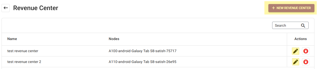 Click + New Revenue Center to create a new one, or click the corresponding pencil Icon to update an existing one or click the Trash Can to delete it.