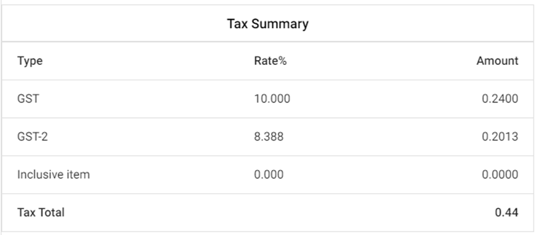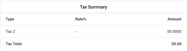 Tax Summary – Displays a Summary of the Taxes collected during the selected Time Period, with columns for Type, Rate % and Amount which has a Tax Total.