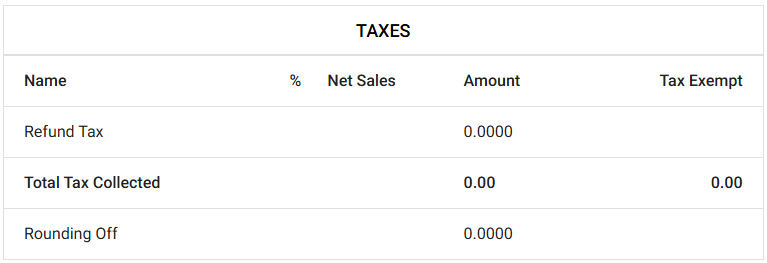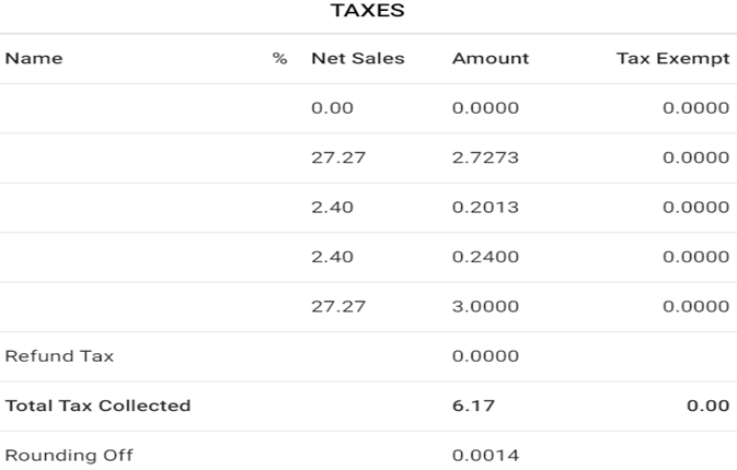 Total Tax Collected appears for Amount and Tax Exempt, with Rounding Off having a value just for Amount.