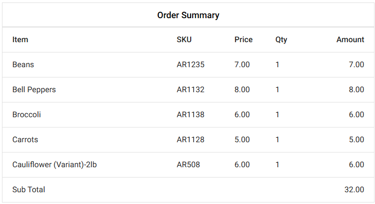 Order Summary – Displays Order items (including Modifiers), Price, Qty and Amount along with Sub Total.