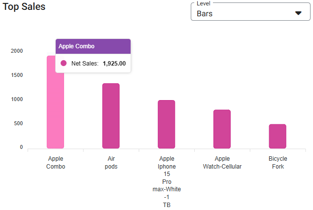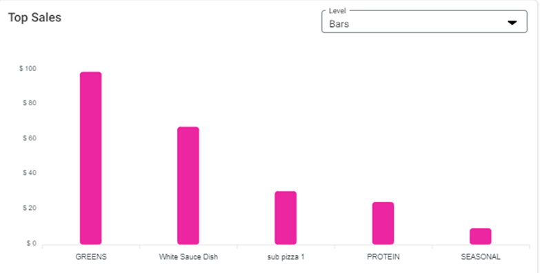 Top Sales – Displays a graph of the top selling items based on the above selections. It can be displayed by Level (Bar or Donut). You can mouse over an item to view its exact Net Sales.