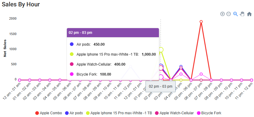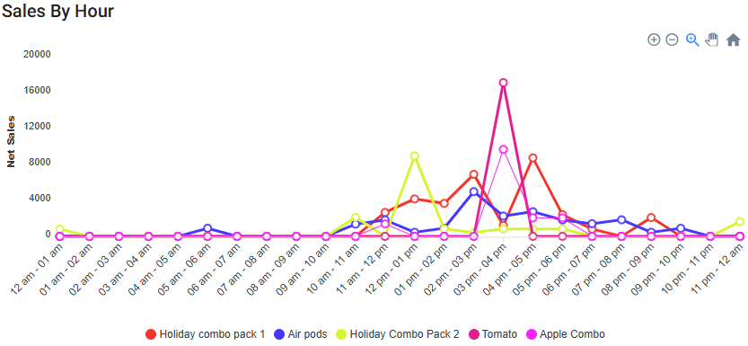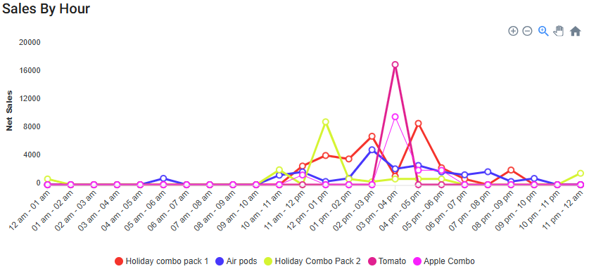 Sales By Hour - Displays a chart of each item's sales broken down by hours of the day.