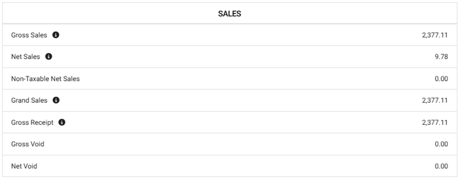 - Gross Receipt – The Gross Receipt during the selected Time Period, and will display only when the Gross Receipt toggle in Settings > Reports > Sales Recap Report > Sales is Enabled (Yes).