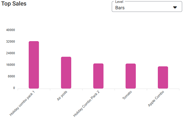 Top Sales Graph – View the Top Sales, broken down by Category. It can be viewed as two options via the Level dropdown: