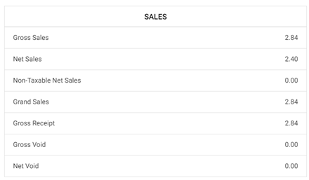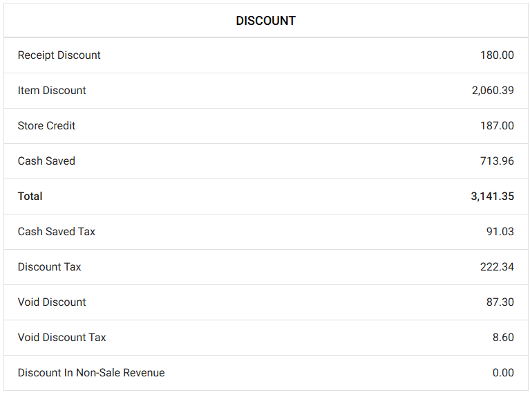 - Discount – Includes the Receipt Discount, Item Discount and its Total followed by Discount Tax, Void Discount, Void Discount Tax, Cash Reward and Discount in Gift Card is displayed.