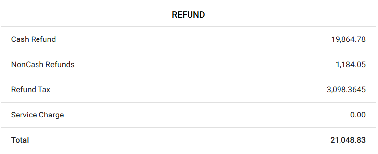 - Refund – Displays the refunds that have taken place during the selected Time Period. This includes Cash Refund, Non cash Refund and Refund Tax along with the Total. This section will be displayed only when values are above zero (0.00).