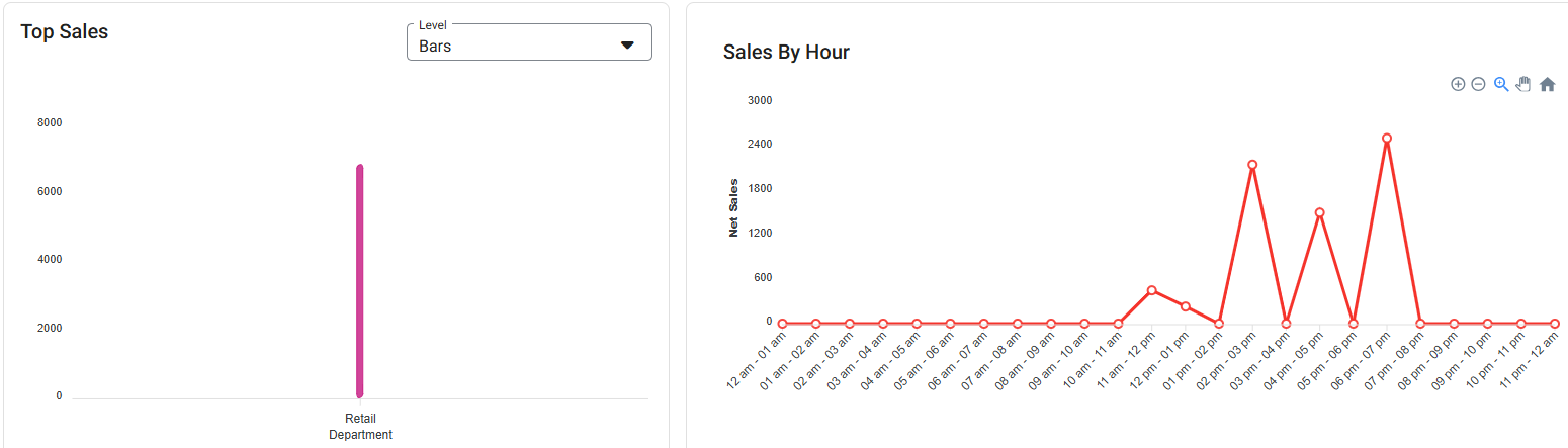 Displays data from all Retail Items by default, with the Top Sales in Graph and Table form, and the Sales By Hour chart.