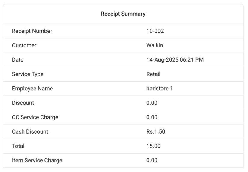 - Total Tax – All Taxes (except inclusive tax) applied to the Receipt.