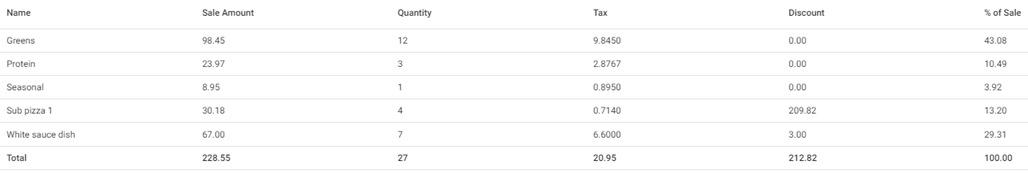 Table - Displays a comprehensive breakdown of all selected items sold within the selected Time Period.