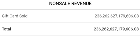 - Non-Sale Revenue – Includes revenue aside from traditional sales during the selected Time Period. Includes values for Gift Card Sold/Recharge, House Account Sold/Recharge, Delivery Charge Cost, Membership Sold/Recharge, Gratuity and Online Order Service Charge.