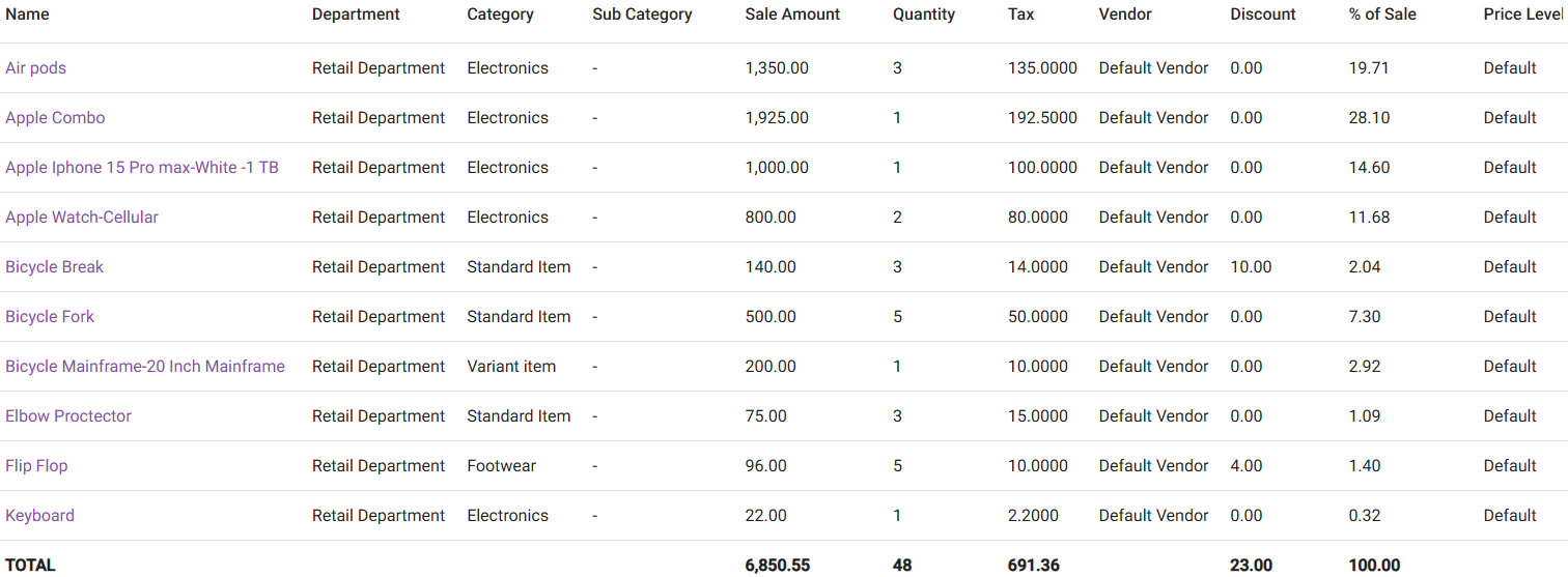 Default View – The following fields appear: Name, Sale amount, Quantity, Tax, Discount and % of Sale.