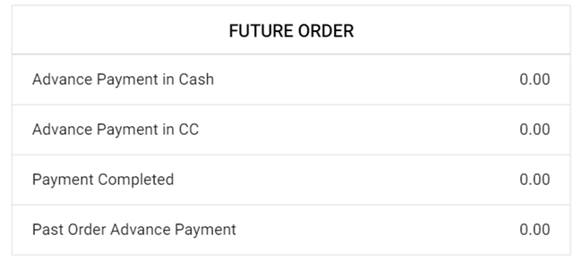 - Future Order – Displays financial data based on Future Order activity. The fields Advance Payment in Cash, Advance Payment in CC, Payment Completed and Past Order Advance Payment are displayed by default.
