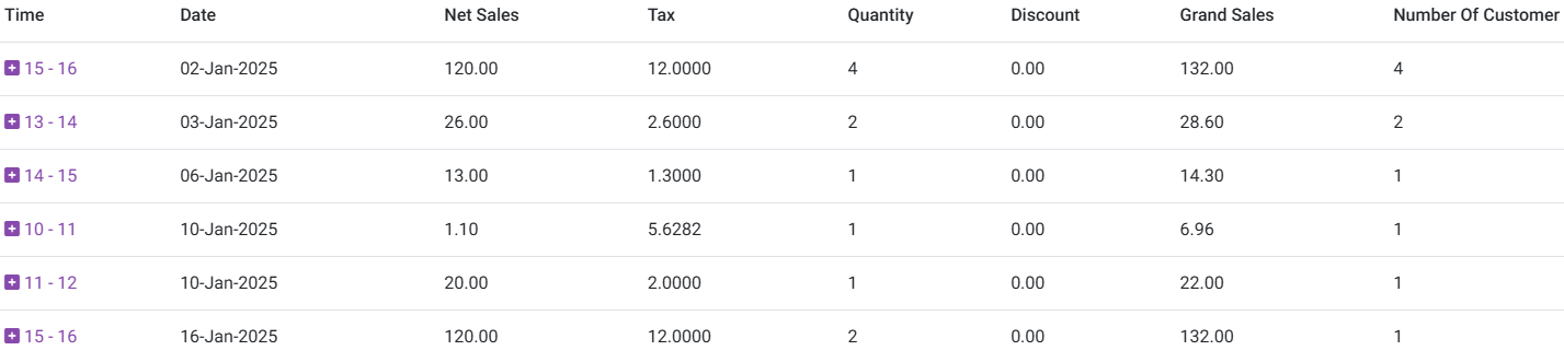 Time – The hourly period, populated based on the selected Date format in Application settings. When you click on a Time, it will expand to show all the activity that took place during the selected Time Period. The expansion provides the table broken down by Menu Items during that Hourly period.