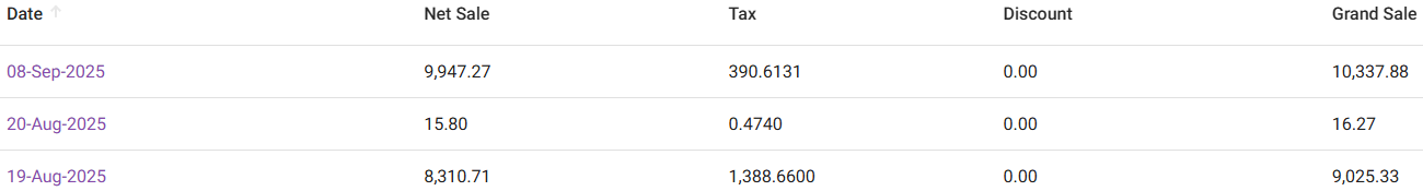 Detailed View – The following fields appear: Seq.No, Name, Unit Price, Quantity, Excludes Tax, Tax, Total Amount, Discount and % of Sale.