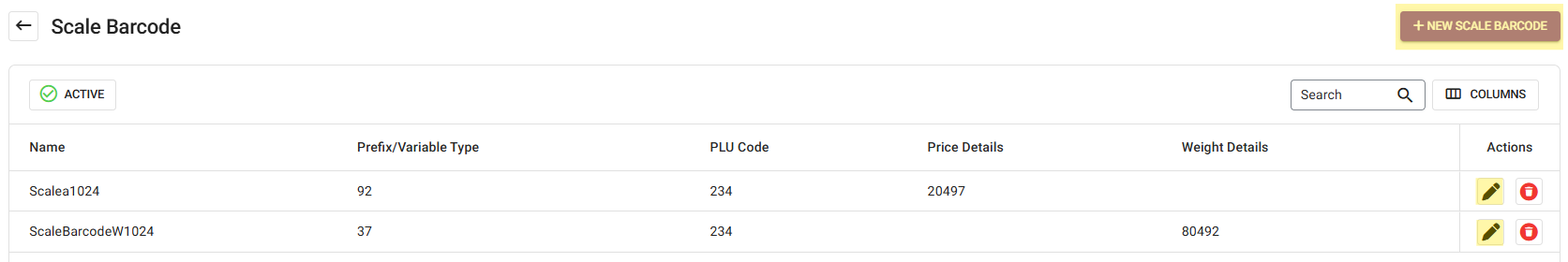 The Scale Barcode screen contains a table with columns for Name, Prefix/Variable Type, PLU Code, Price Details, and Weight Details. Also, there are actions for Edit (Pencil) and Delete (Trash Can).
