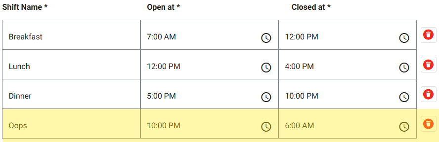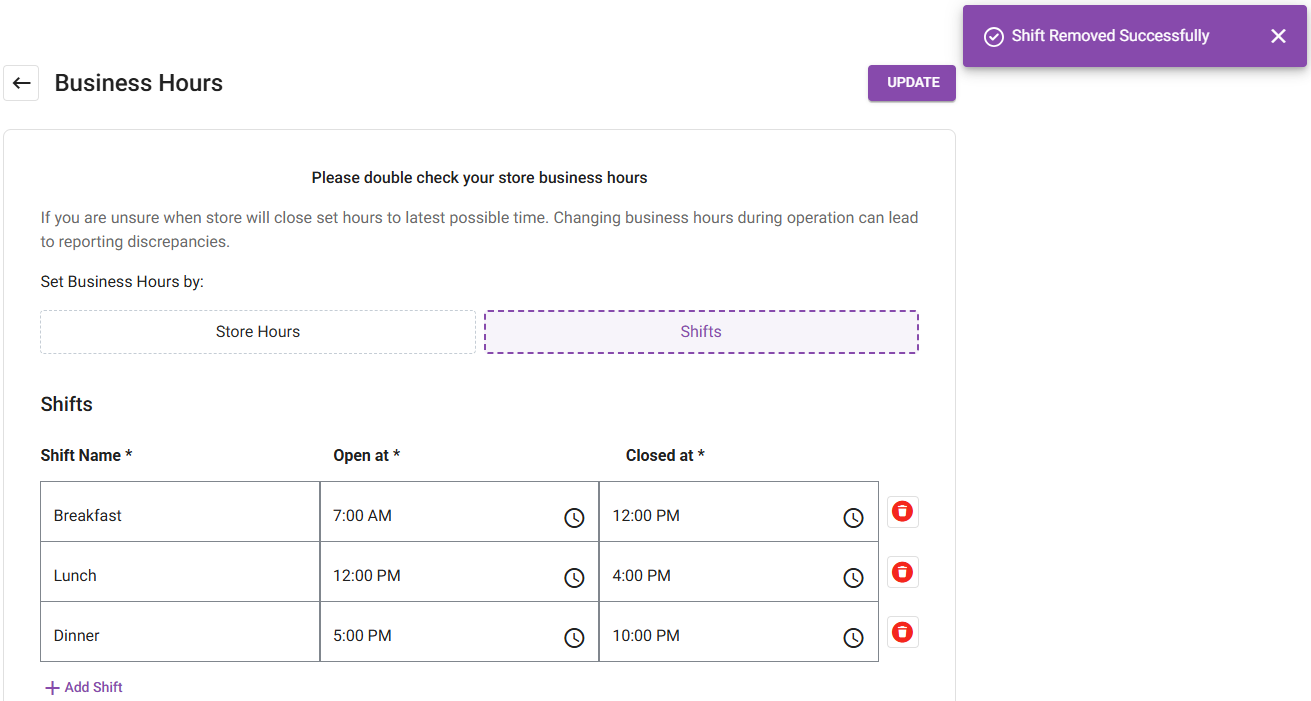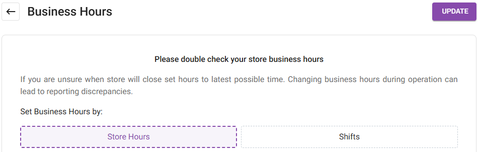 Sign into the Back Office. On the left-side Navigation Panel, click Settings. On the Settings page, under Store click Business Hours. For Set Business Hours By, select Store Hours or Shifts. Store Hours Shifts Store Hours For each Day, select whether ...