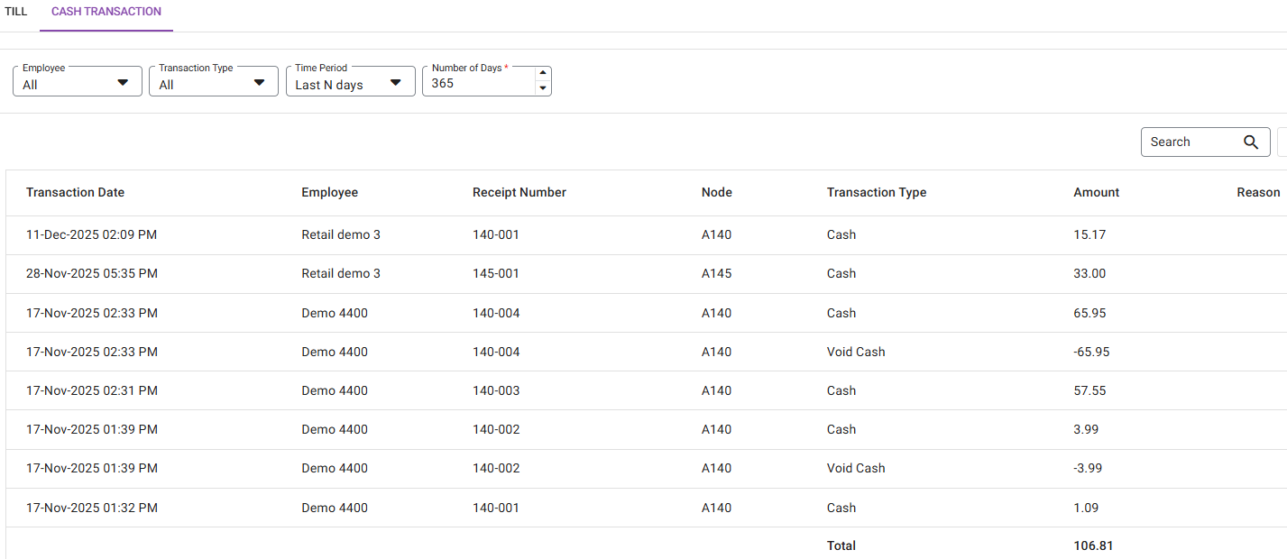 Displays cash-based Till transaction activity.