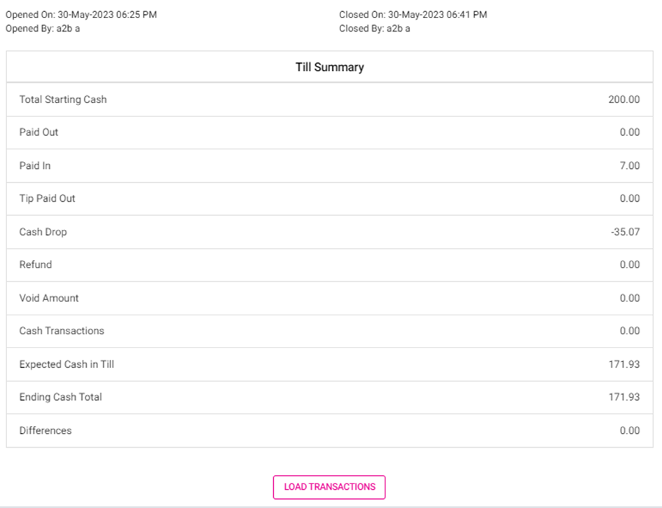 Click Load Transactions to display a table of all the transactions involved in this till (paid in/out, refund, cash drop, etc.).