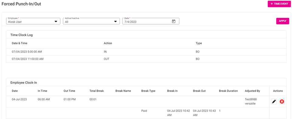 View the saved Time Event: select the Employee and Date at the top, then click Apply. The Time Event appears under Time Clock Log.