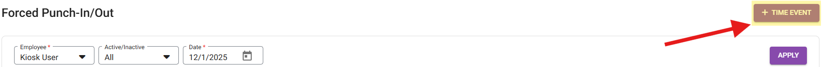 The Forced Punch-In/Out page displays options to view Time Clock and Employee Clock-In events based on Employee, Active/Inactive status, and the Date (followed by clicking Apply).