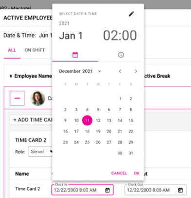 Select the time Clock In Date/Time and Clock Out Date/Time. For Only the Current Date and the Immediate Future Date will be enabled.