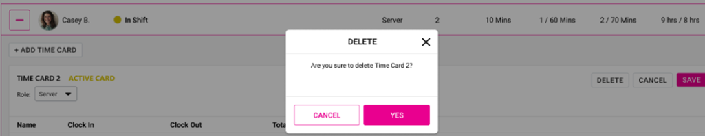 On the Delete pop-up that appears, select YES to confirm deleting the Time Card.