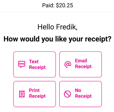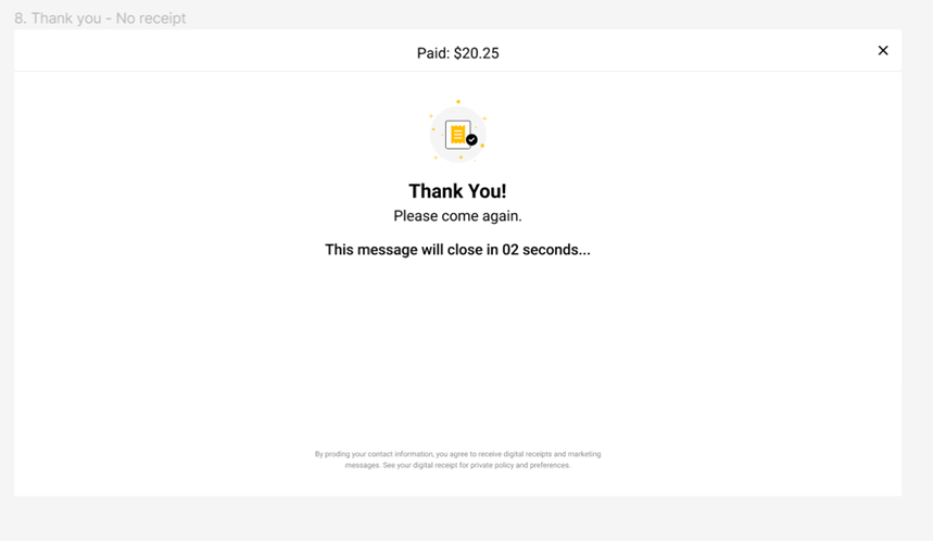 Once the number is entered and Done is pressed, the Thank You! screen appears confirming the Paid amount and that the receipt has been communicated per the Customer's selection. A countdown will appear until the page auto-closes, or click X at the upper-right to manually close.