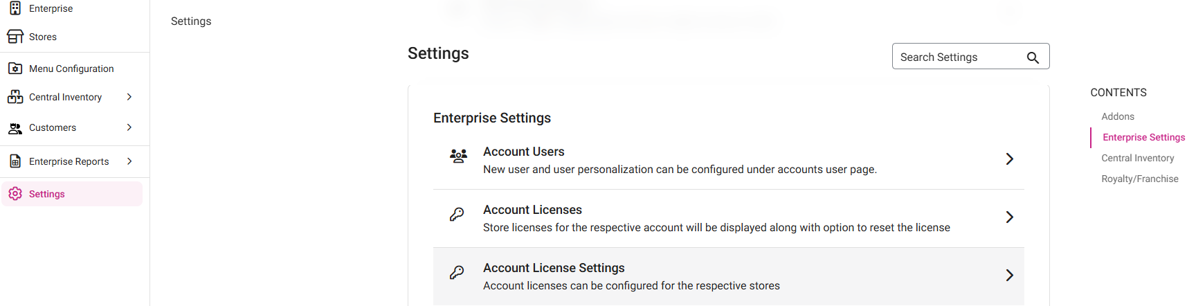 Navigation: Log into Enterprise, then select Settings. Under Licenses select Account License Settings