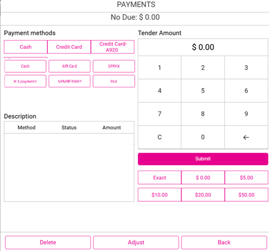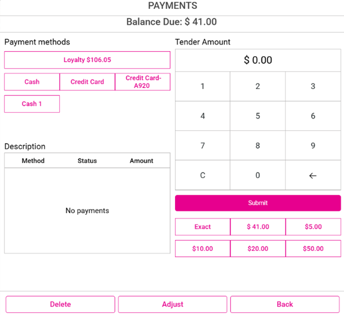 Customer must be attached to the Order to use Loyalty, which will appear as an option on the Payments screen. The Loyalty [Amount] option is selected and Submit is pressed.