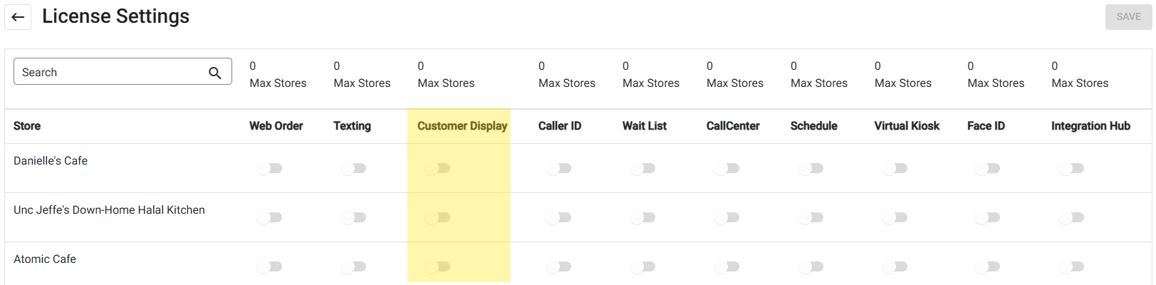To integrate CDS with RETAIL POS, the Customer Display toggle must be enabled for the specific Store. Make sure to click Save to apply the licensing change.