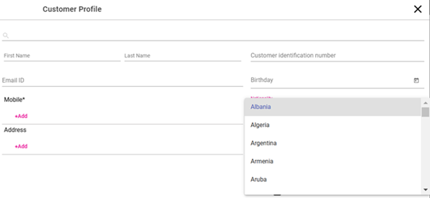 If the Disable Customer Nationality toggle was set as NO: the Nationality field appears, where you can select the nationality from the dropdown list.