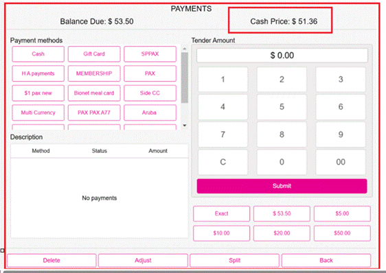 - Currently when making partial payment, the cash price gets adjusted based on the receipt total, therefore the cash price will not be adjusted but will remain equal to the Balance Due (same value as credit card)