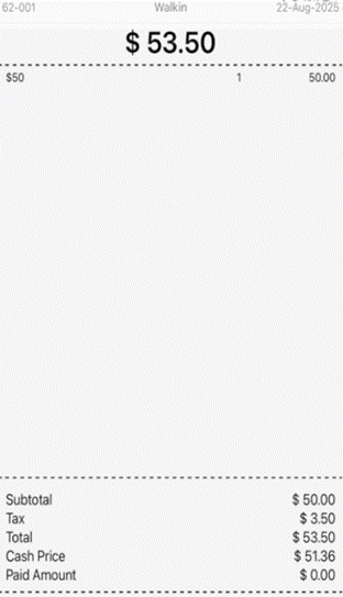 Pay by cash will be = Total – ((Total Retail price * Dual price %) + (tax amount * Dual price percentage) 53.5 –((50*4%) + (3.5*4%)) = 51.36