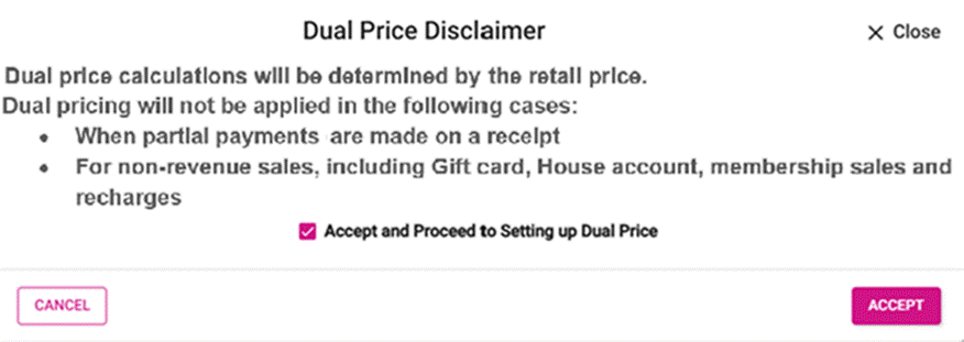 - When enabling the Dual Price option, the Dual Price Disclaimer pop-up appears.