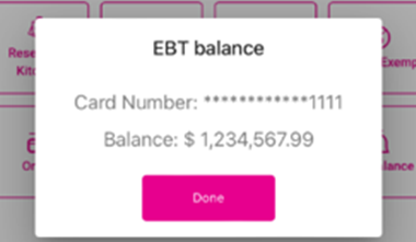 The EBT balance pop-up appears, showing the Card Number (with all but last 4 numbers hidden) and the Balance. Click Done to close the pop-up.