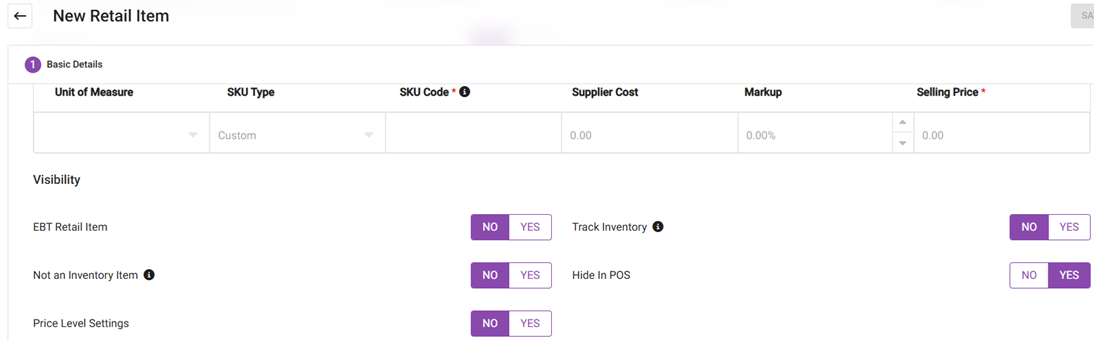 On the (1) Basic Details page under the Visibility section, enable the EBT Retail Item toggle (set to YES), then click Save at the upper-right.