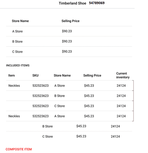 Example: If Pencil is selectedanother screen appears which displays the details of Current Inventory and Selling price of the item that user searched under different stores in the Enterprise.