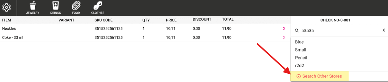 The Search Other Stores option appears at the bottom of the item search window.