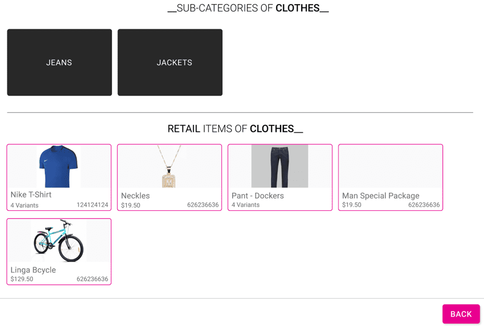 If Subcategory is tagged, then the same will be displayed or if there is no subcategory then the retail item tagged will be displayed. Upon selecting a subcategory, the items tagged to subcategory will be displayed. Click the Back button to close the category/subcategory/retail item pop up.
