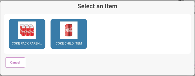Parent item of COKE PACK and its Child COKE. Both will appear and the selected item will be added to the Order.