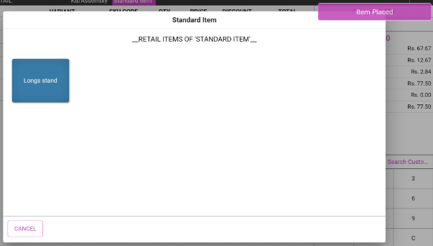 Standard item which is created in the BO will be displayed under its respective category. To place the item with Standard item in POS: click on the standard item and item will be placed in the order screen along with the 'Item Placed' confirmation message.