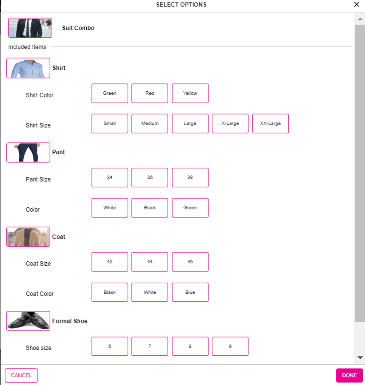 Kit/Assembly is a combo item. All the standard and variant items added in the combo will be displayed. If it's a standard item, it will display along with the name of the standard item and an image of the item. If the standard item has any variant (such as Bracelet - Navy blue) that will appear, and the item will be grayed out. If a variant item is mapped to a Kit Assembly item, the parent name of the variant item will be displayed along with image of the variant item and attributes created for the variant item will be displayed in traditional order (below example Suit Combo: Shirt, Pants, Coat then Shoe).