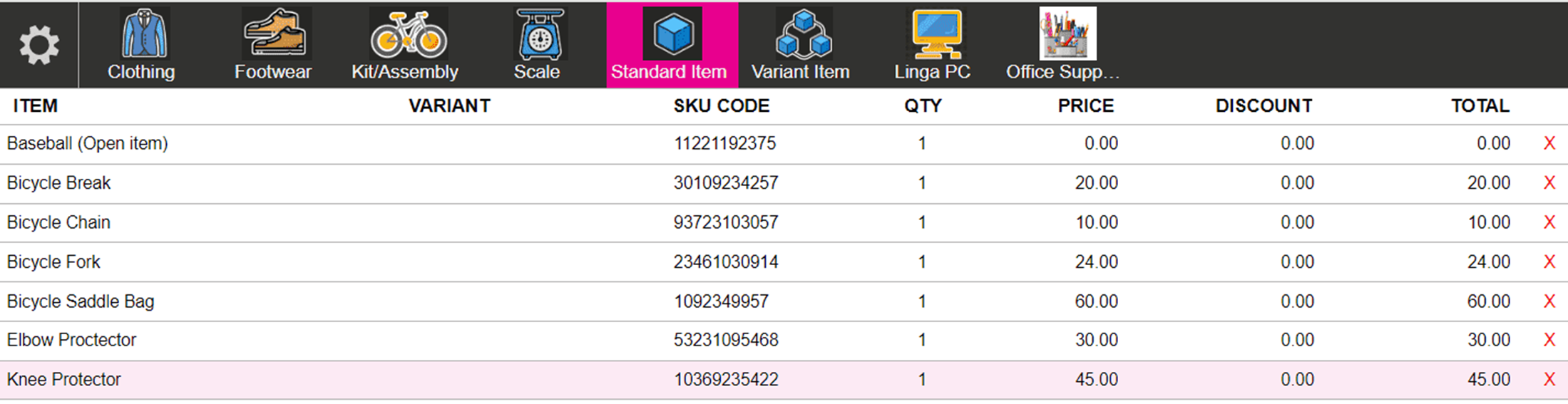 The X icon appears at the end of each Item's row to remove the item.