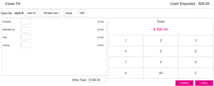 Different Multi Cash payment methods from setting up Open Till will appear next to the Employee Name.
