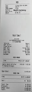 Multi Currency tendered line item will appear on the receipt as well. It will display the net actual Multi Currency paid. (example: DA 110.00)