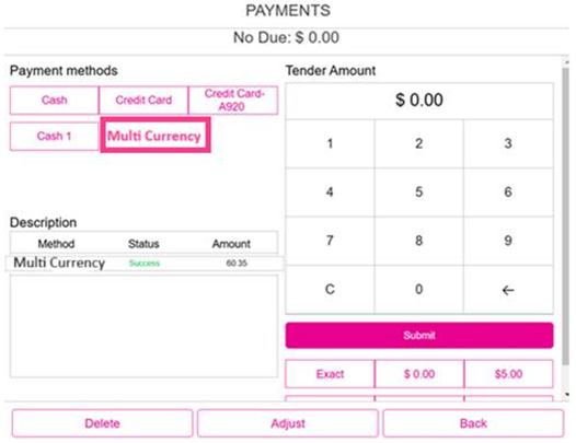 Note: The Payment Name created in the BO settings will appear on receipts ('Multi Currency' is not a static text).