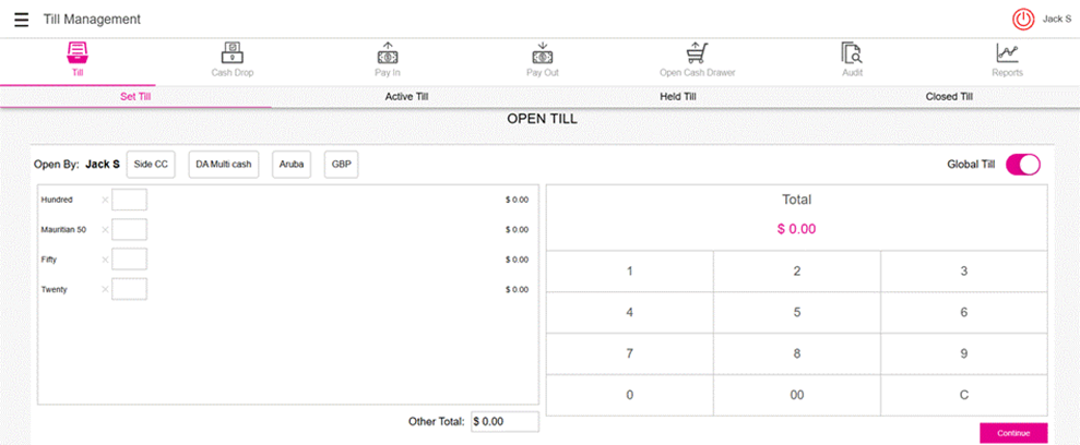 Upon entering the numerical value in the number pad screen, the denomination marked in Back Office will appear in the Open Till page.