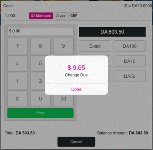 If the paid multi-currency value is more than the Check, the remaining Change Due will appear in POS.