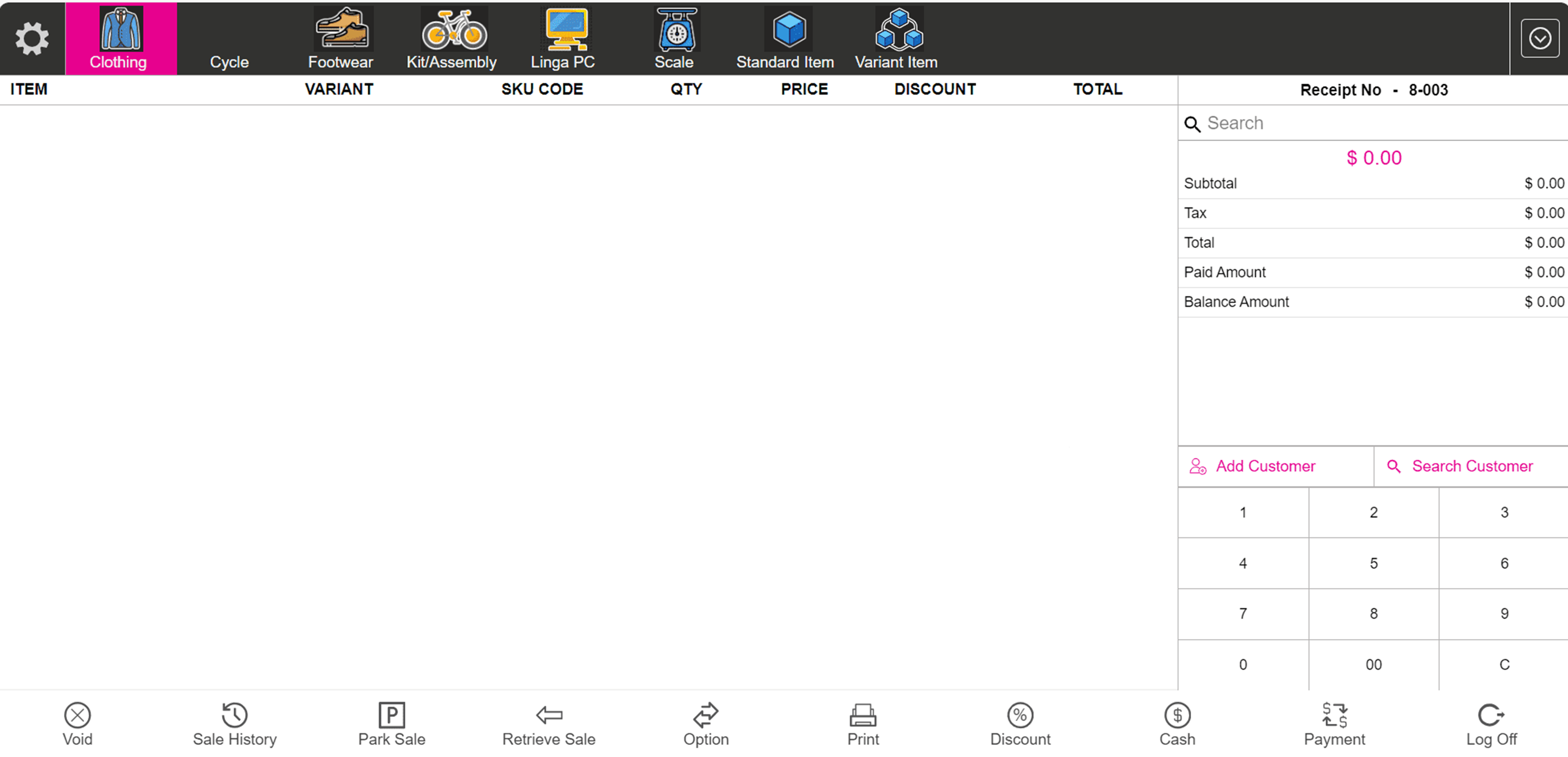 The main screen appears - with the Void, Sale History, Park Sale, Retrieve Sale, Option, Print, Discover, Cash, Payment, and Log Off options appearing at the bottom.