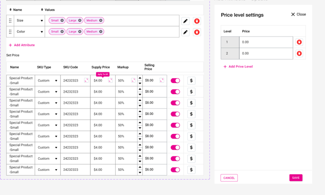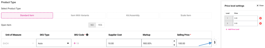 On the Retail Item creation screen, the dollar sign ($) button to the right of the Selling Price is available for Price Level Settings. Clicking the button, you can add a Price Level for the particular Retail Item. Price Level Settings applies to Standard Item, Item with Variant and Scale Items.